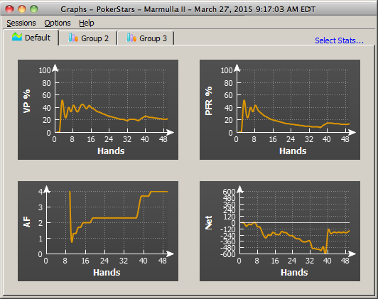 /W: Went to Showdown and Won percentage. - Net: The chip amount that this player is up or down for all hands tracked. It is very interesting to observe how different playing styles (see VPIP, AF, etc) correlate with winning or losing patterns. Also, the balance may represent additional useful information regarding the player's current mindset (who is more likely to "play it safe", who is getting desperate, who is about to "go on tilt" etc).